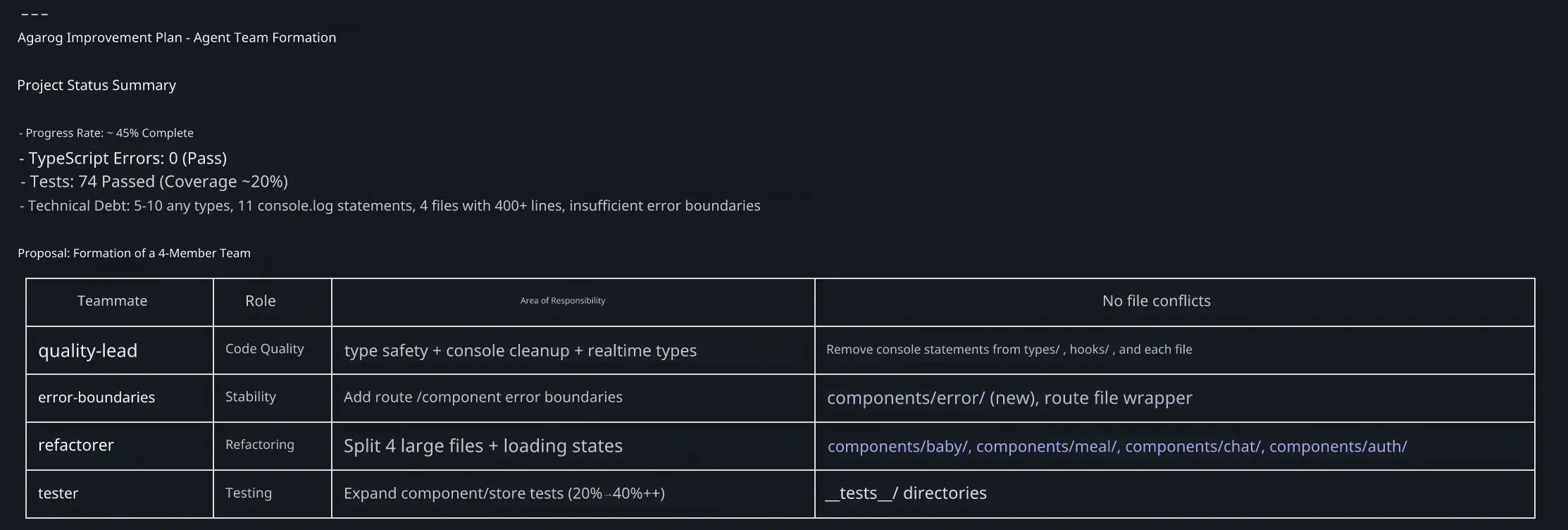 - Mutual coordination: Teammates communicate during work—for example, when the refactorer changes file structure, the tester can recognize and adapt.