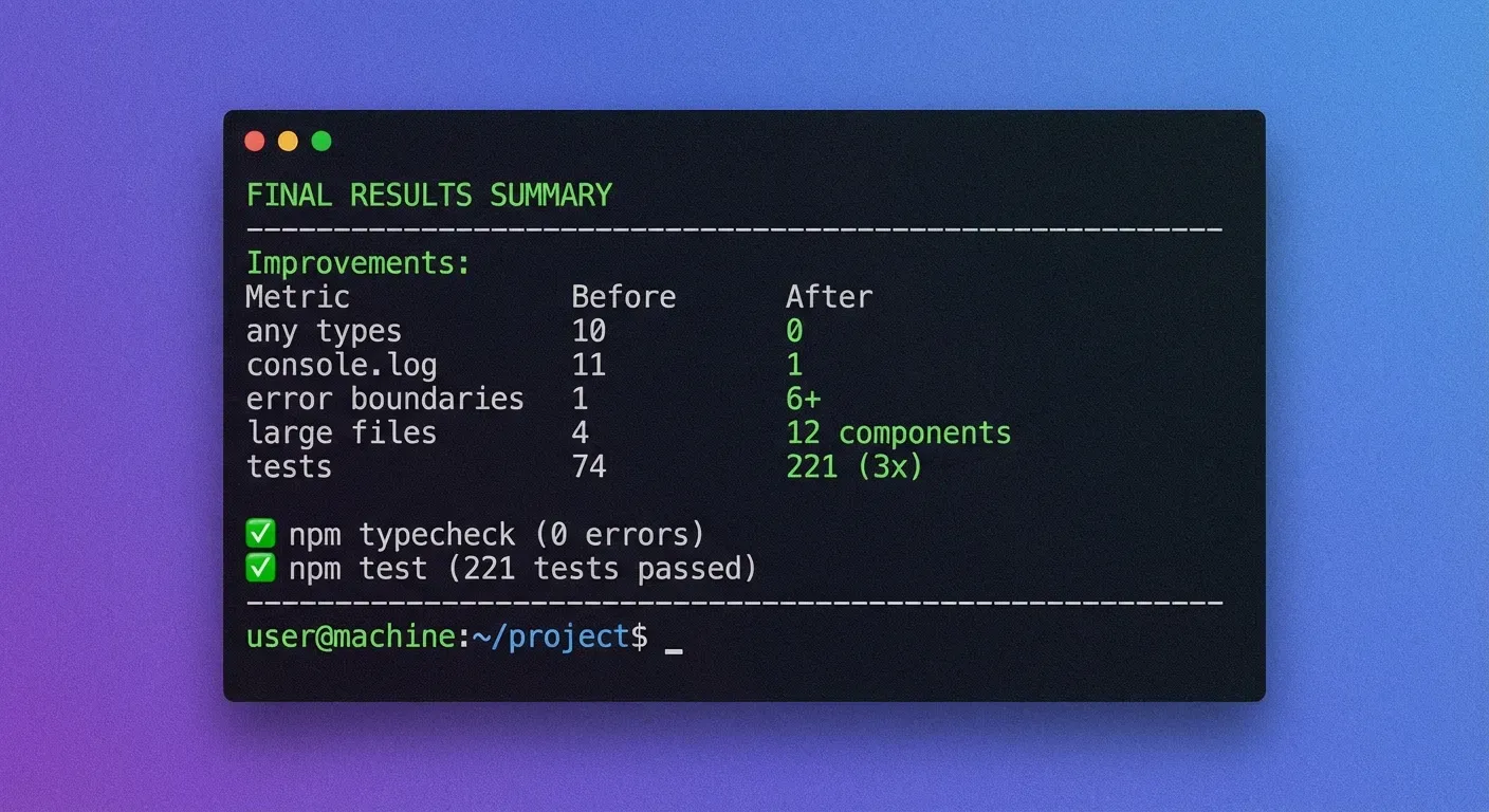 anytypes, 11 console.logs, 4 files over 400 lines, missing error boundaries