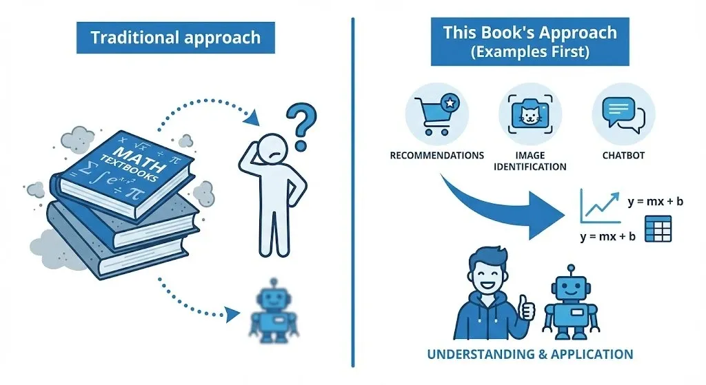 이 책은 반대입니다. 실제로 사용되는 사례를 먼저 보여주고, 그 기능을 구현하는 데 필요한 수학으로 자연스럽게 연결합니다.