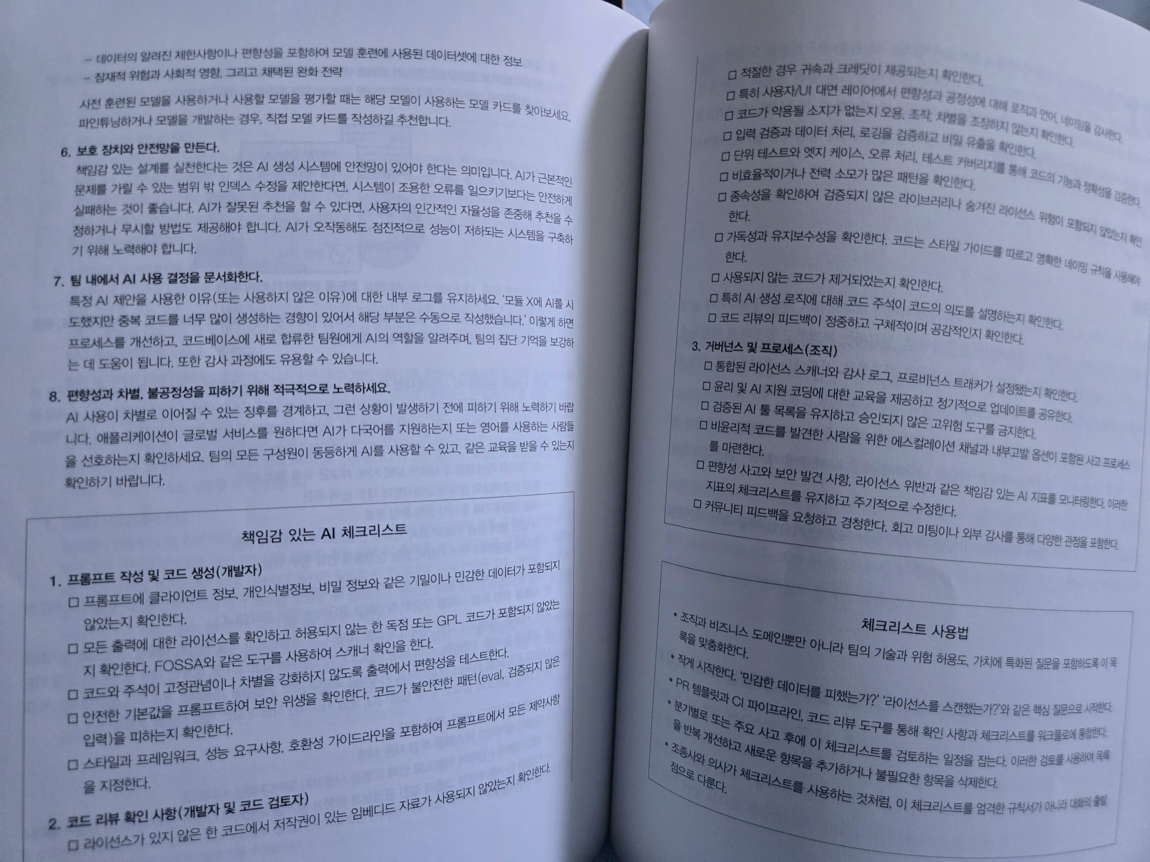 바이브 코딩의 윤리적 쟁점도 언급합니다. 지적재산권, 편향성, 공정성 등의 이슈가 있으며, 책에서는 AI를 활용할 때 주의해야 할 점에 대한 체크리스트도 제공합니다.